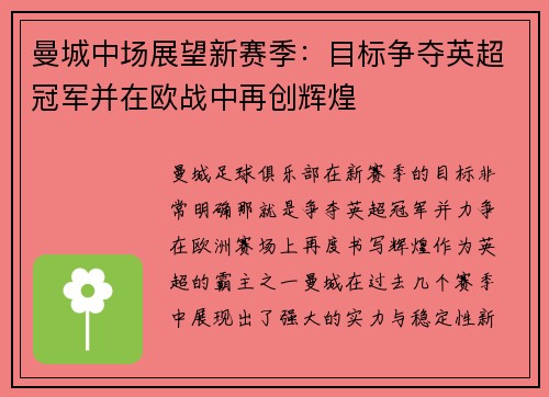 曼城中场展望新赛季:目标争夺英超冠军并在欧战中再创辉煌