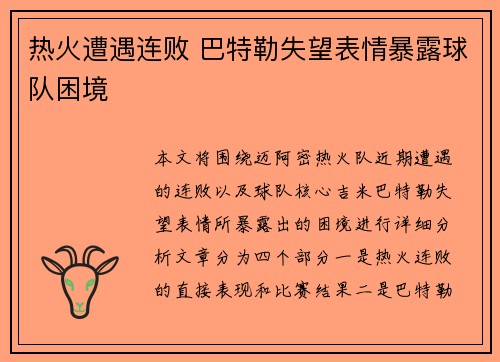 本文将围绕迈阿密热火队近期遭遇的连败以及球队核心吉米·巴特勒失望表情所暴露出的困境进行详细分析。文章分为四个部分:一是热火连败的直接表现和比赛结果,二是巴特勒失望表情背后的心理因素,三是球队整体表现的低迷及其原因,四是如何解决困境并展望未来...
