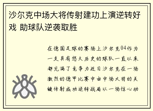 沙尔克中场大将传射建功上演逆转好戏 助球队逆袭取胜
